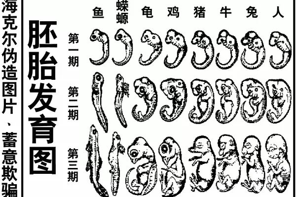 那么,为什么海克尔和理察逊的研究结论差异如此之大呢?原来,海克尔有意选择形态上比较相近的动物胚胎,比如他用水生的蝾螈代表两西栖类,而不用青蛙,因为蝾螈本身更象鱼。又如早期鸡的胚胎其眼球是没有色素的,但海克尔把它涂黑,使得鸡的胚胎和其它动物胚胎更相似。海克尔特别对人的胚胎图作了艺术加工,去掉了人胚胎的内脏部分和腿,就成了一个有尾巴,类似鱼的胚胎。