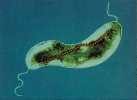 这种在大约三十亿年前已存在的细菌,具有本能测知地球磁场的特性,因此能在汪洋大海中随处遨游而不迷失方向。这些细菌在高倍率电子显微镜的镜头下,显示出一长列整齐组装的单晶磁铁颗粒,借由细菌的蛋白质连结在一起而产生一磁性偶极矩,因而能与地球的磁场感应而定出方向。巧妙的是,这些磁性颗粒正是科学家竭力研发,想要用作计算机信息储存的基本材料。而在几十亿年前,这些细菌却能在室温制造出这些现代科技必须在高温所产生的单晶磁性颗粒。