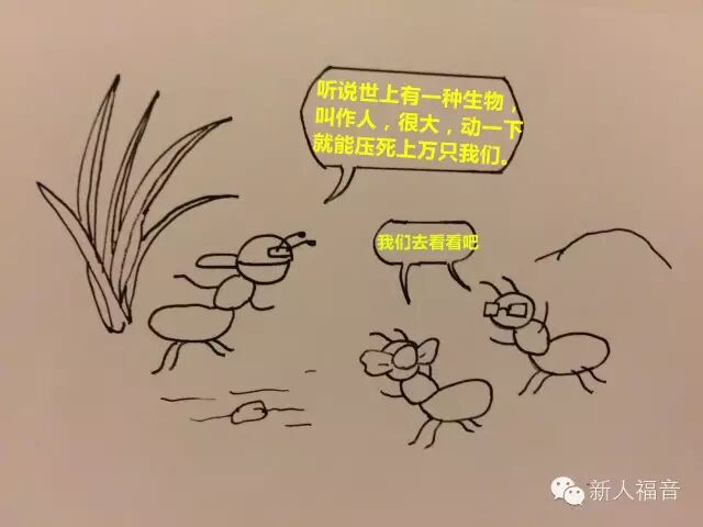 有三只小蚂蚁聊天时谈到了“人”。其中一只蚂蚁说:“听说世界上有一种生物,叫作人,身体特别大,也特别有能力,人动一下就可以压死成千上万只像我们这么大的蚂蚁。我们要去看看,人到底是个什么样子。”