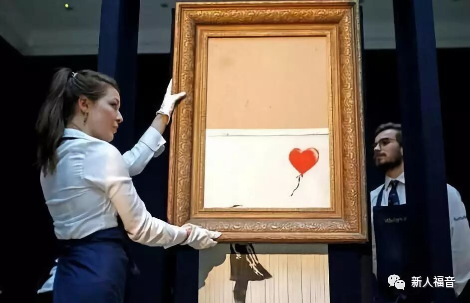 10月5日,英国著名画家班克斯(Banksy)的名画“女孩和气球(Girl With Balloon)”在苏富比拍卖行拍卖,以104.2万英镑落锤成交后,不到几秒钟画作当场自行损毁。原画定格在一半完好一半损毁的状态,留下了一只完整的红心气球。在社交媒体上,班克斯对于画作被毁也做出了解释,几年前他就在画框中装了秘密装置,是为了“万一它有一天要被拍卖”。